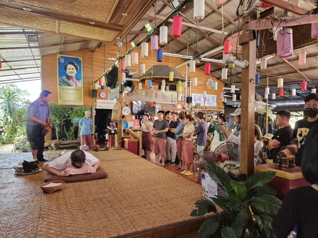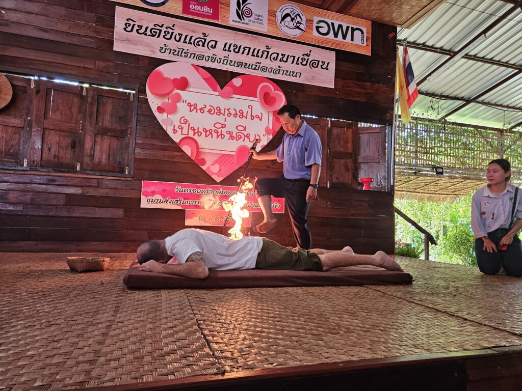 I traveled with a group to witness a well-known Thai masseuse demonstrate his therapy. He brushes his foot through the flames, then swipes it across an oiled rock, then “steps” on the person’s body part. In effect, it’s a hot oil massage.