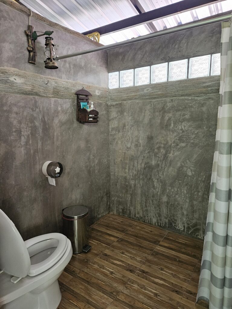 This is the bathroom: toilet and shower, wood floor. Simple and functional.