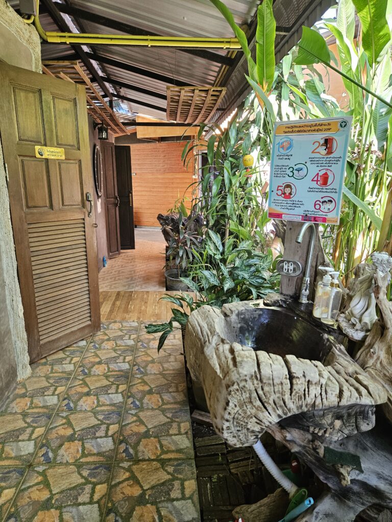 I used the restroom at the Thai massage school. I love Thai aesthetics in how they use natural items for functional use. Here, a wood-block sink. The restroom hallway decorated with greenery as natural shields.
