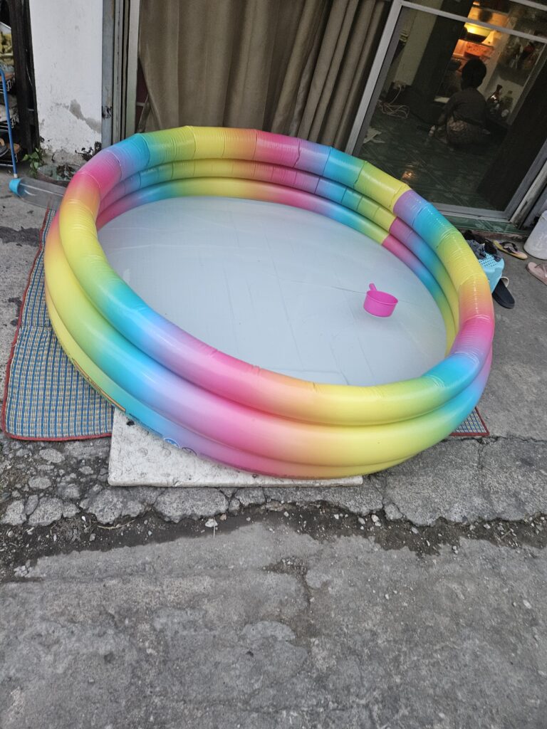 A child’s kiddie-pool (he’s backlit inside the screen). During the hot season, his mother set this pool outside–on the CONCRETE. 40-degrees Celcius? Scorching hot ground? Boiling hot pool water? Not cooling or refreshing? Need I ask more questions?