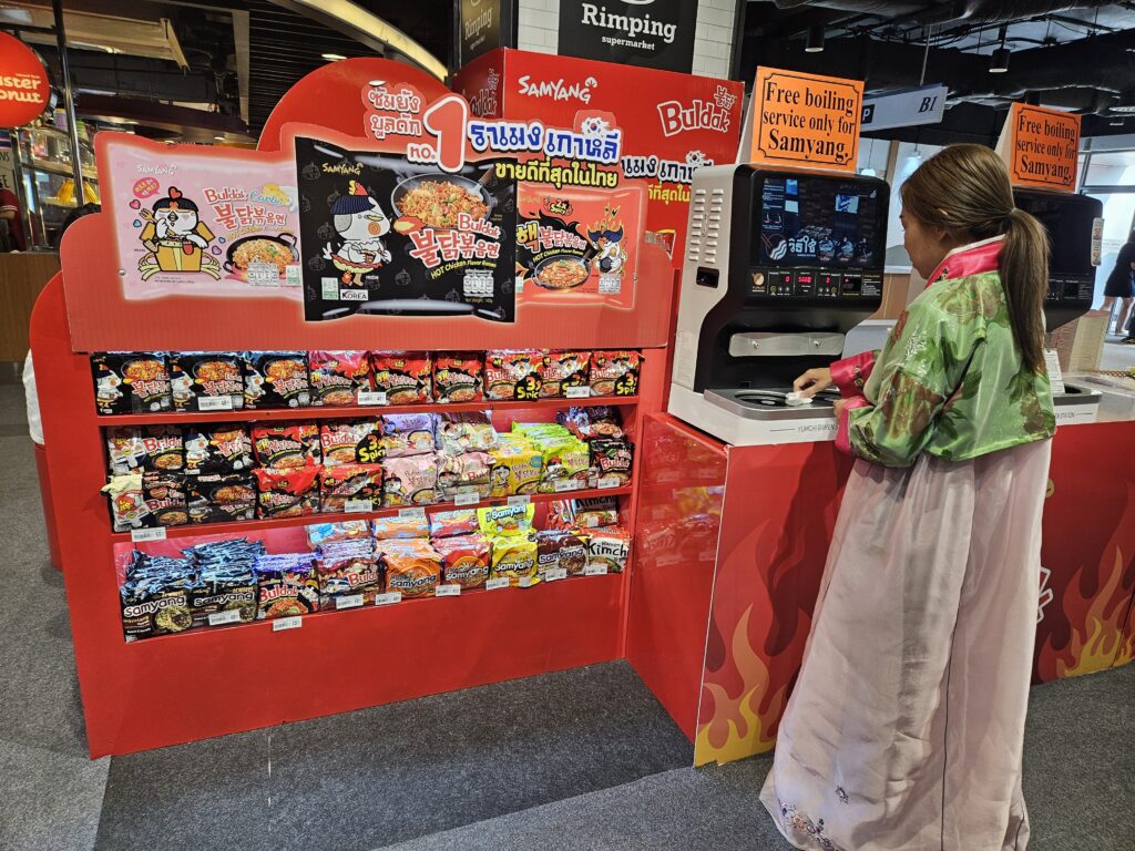 Inside a mall, this Thai employee is dressed in a Korean “hanbok” as she promotes Korean instant noodles.