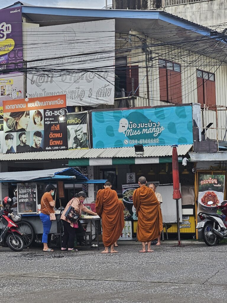 6am: Monks receive food donations from a Thai man (partially hidden). After receiving the donation, the monks will chant a blessing to the man. The women are selecting pre-bagged cooked food for breakfast or lunch.