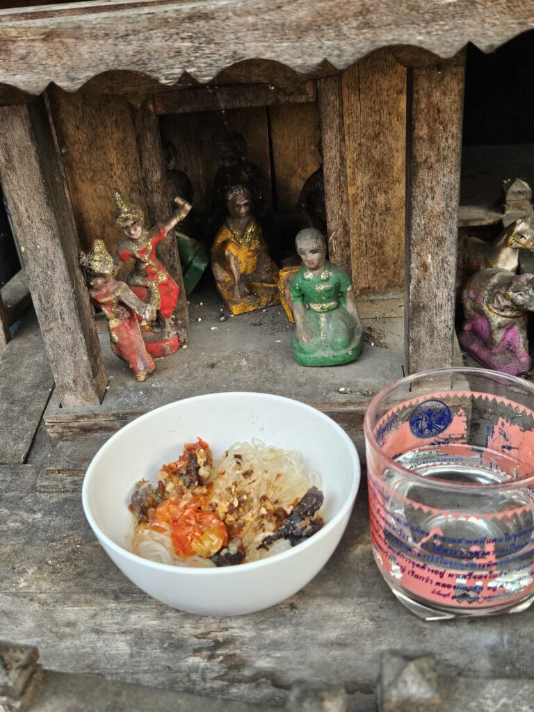 This is a rather humble spirit house constructed of unpainted wood; the figurines worn (indeed, one figurine is worn-out and leaning against the wall!) and faded. The people have offered a glass of water and a bowl of spicy glass noodles.