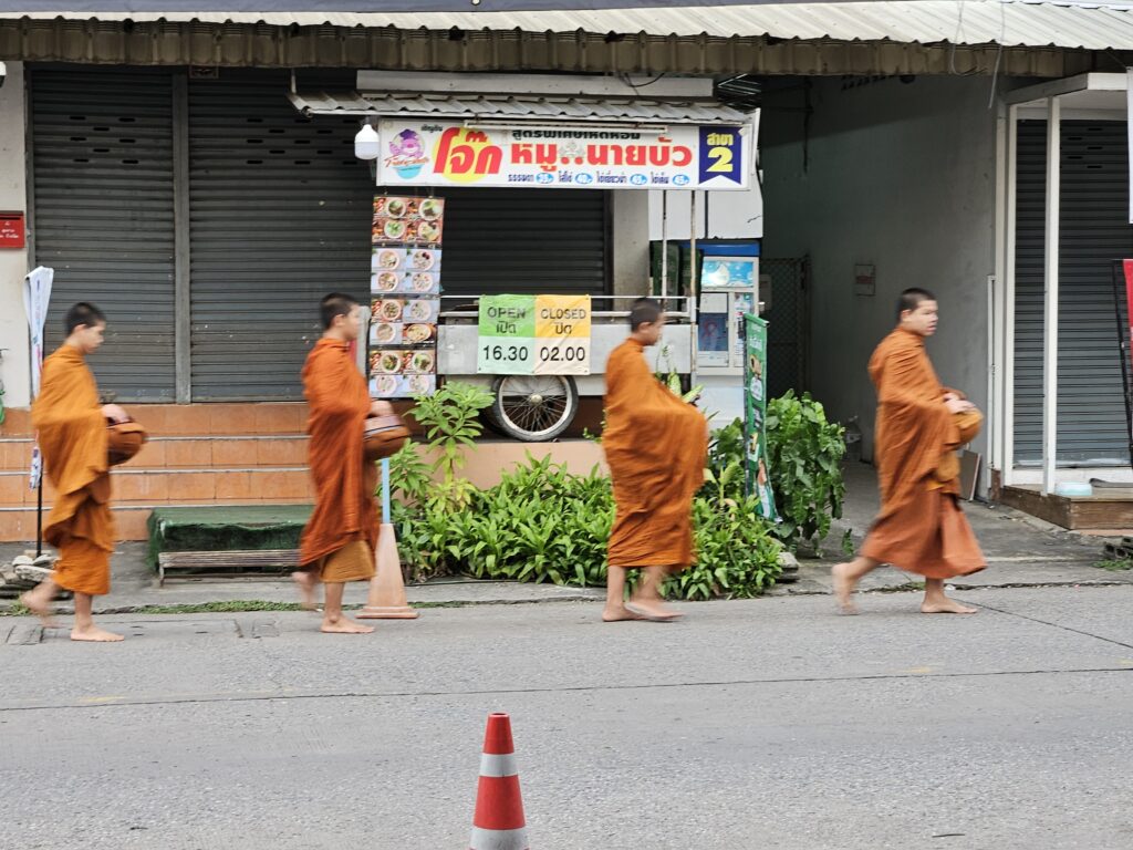 6am: Monks on “pindabhat” or going on alms rounds. They will receive food donations into their bowls. In the Theravada tradition, monks walk in barefeet.