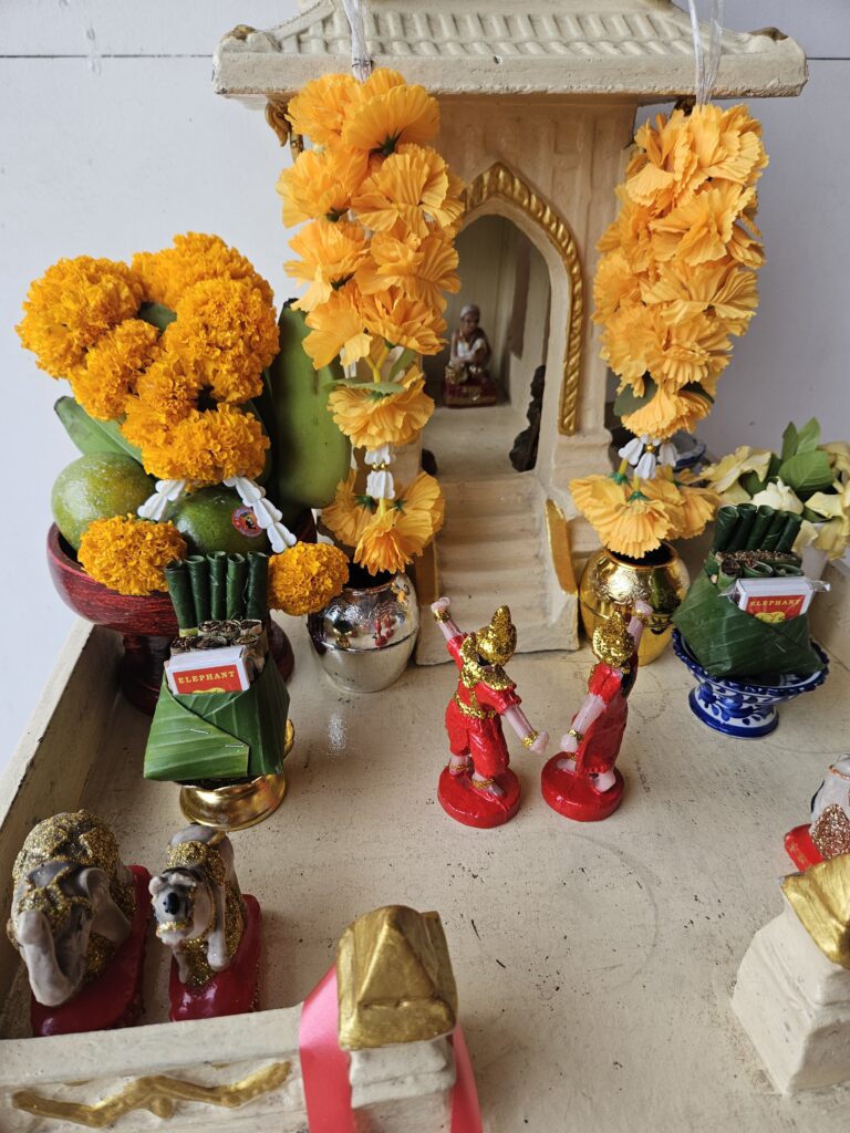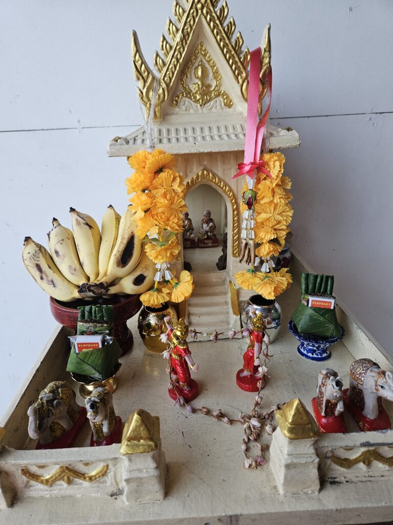 Spirit houses outside corporate buildings, malls, family homes, to hole-in-the-wall mom & pop shops range from grandiose to humble. They resemble a temple, filled with spirits who offer blessings and protection to the business or home. Their blessings expire every 24 hours, thus people replenish the spirit houses in the morning with incense, food, drink, and other items that will fortify their guardians and by extension, bring fortune and happiness to their business and homes.