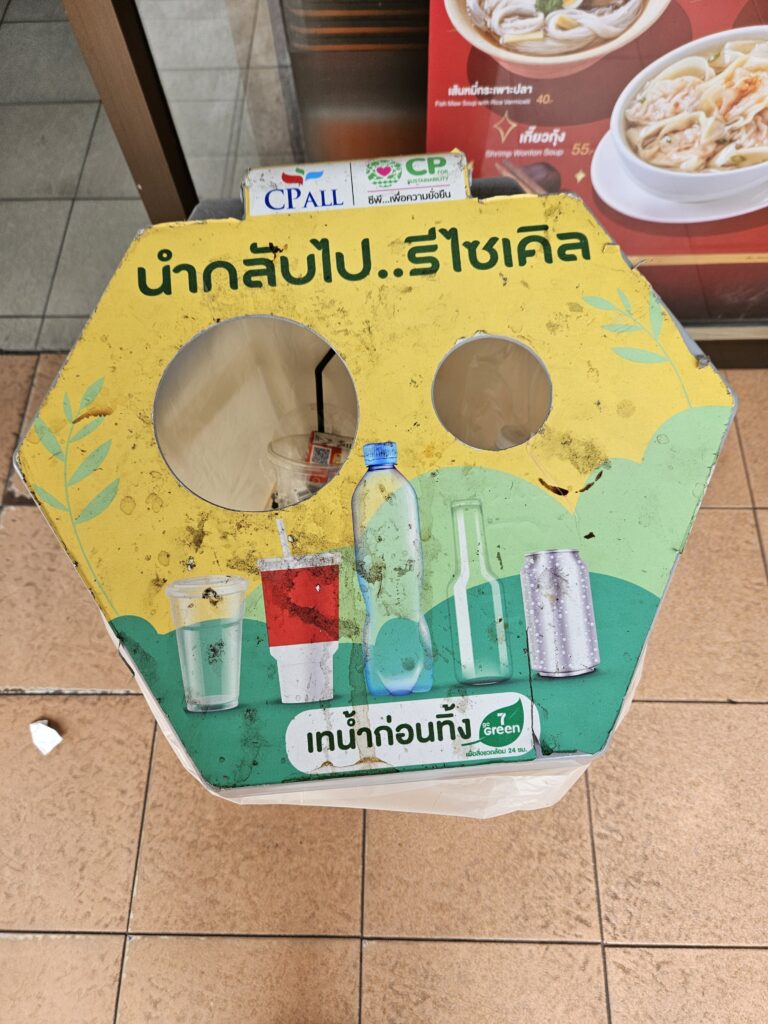 The recycle bin in front of 7-11 offers two different sized holes for different sized containers and bottles. However, they both empty into one big bin, so why the holes?