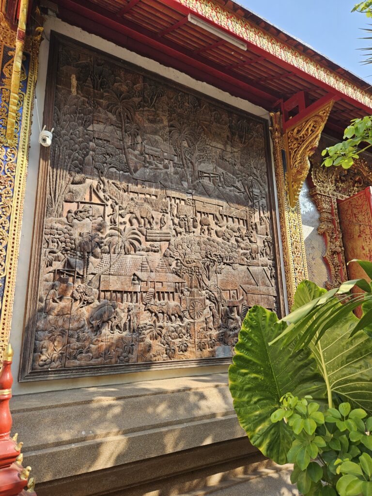 Below: intricate craftsmanship in the carved wooden temple scene, and the gold work.