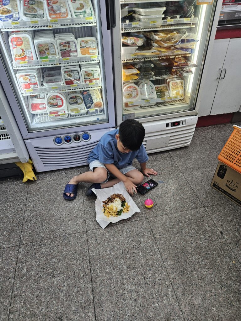 Again, seen at 7-11, this child sits on the floor near the register where his mother worked her shift. He’s eating lunch off of a banana leaf, has a little drink, and is watching a cartoon on his mother’s device. No utensils; sticky rice and grilled chicken are eaten with the hands.