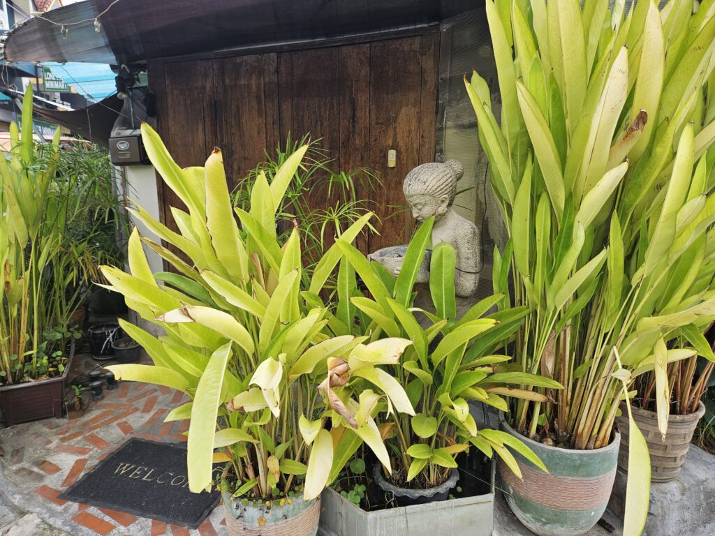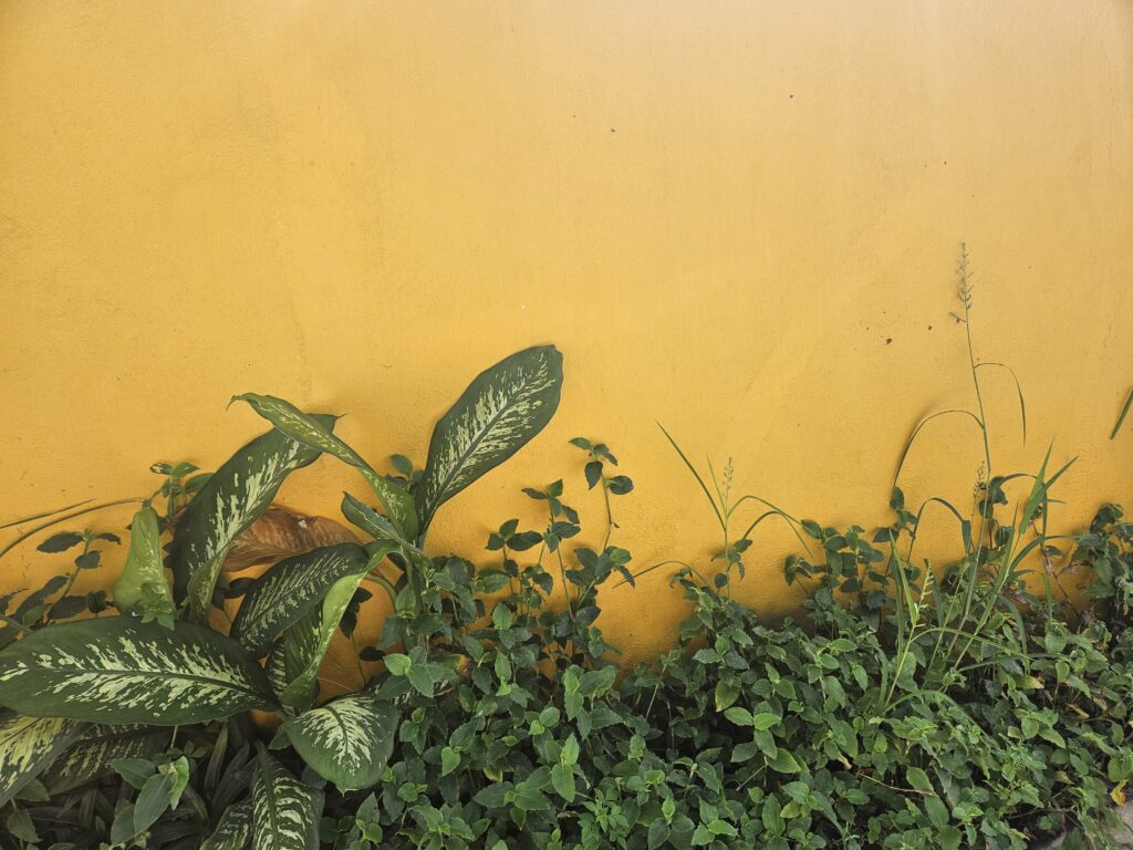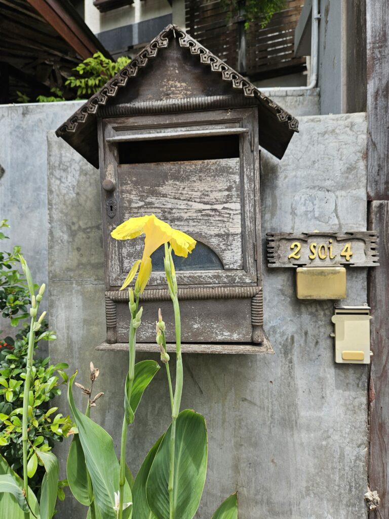 Below: photo of the outside of a motorbike repair shop’s yellow wall with green shrubs facing a busy street, and a yellow flower growing in front of a Thai-style mail box. I find Thai people have an innate aesthetic sense and also incorporate wild greenery for beauty, for shields, for shade. They don’t feel the need to contain and control nature into carefully curated gardens. I resonate with this spontaneity, this idea of “found beauty” as it is.
